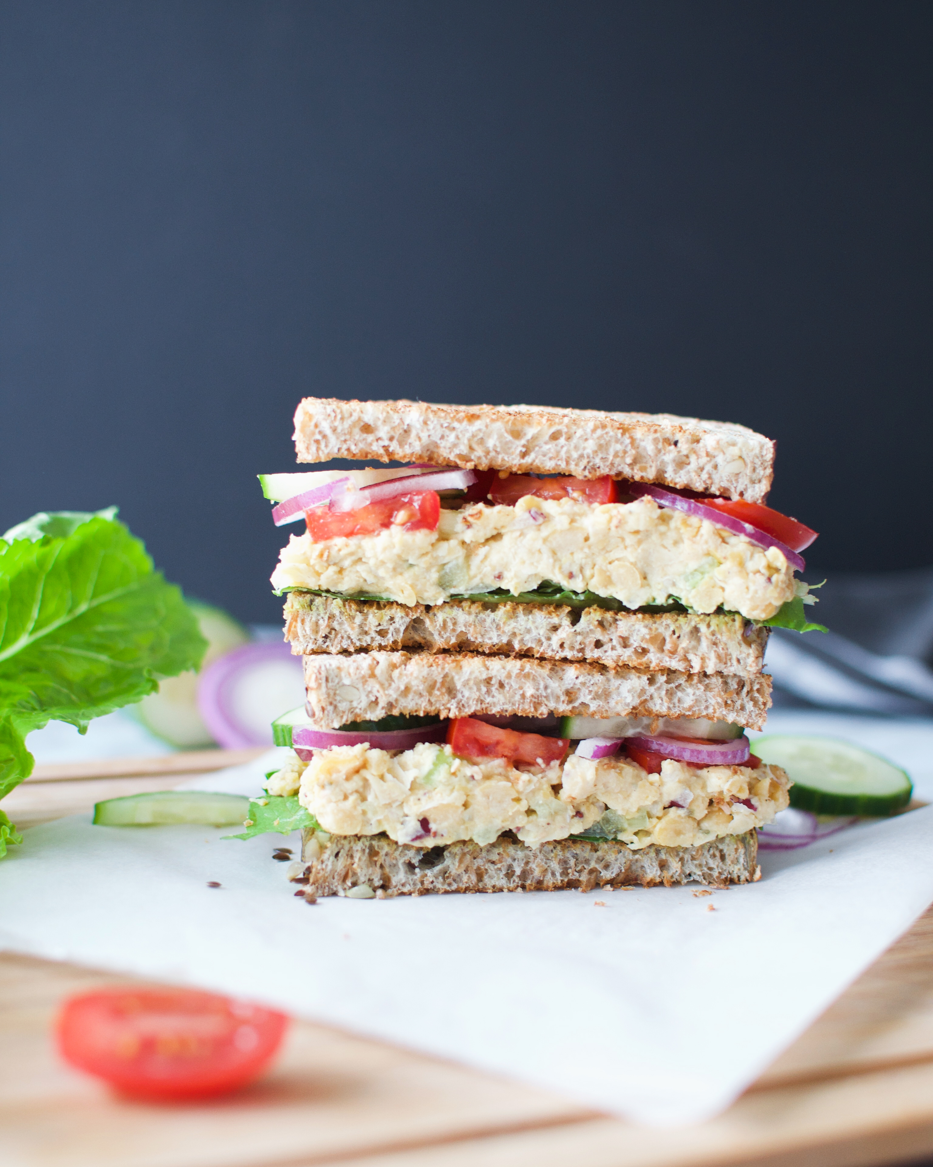 The mix of celery, red onion, pickles, capers, and sunflower seeds gives the mashed chickpeas varied texture and a unique flavour coupled with tahini, dijon and grainy mustard, as well as a touch of vegan mayo. Season to taste with salt and pepper and you’ve got yourself a stellar sandwich!
