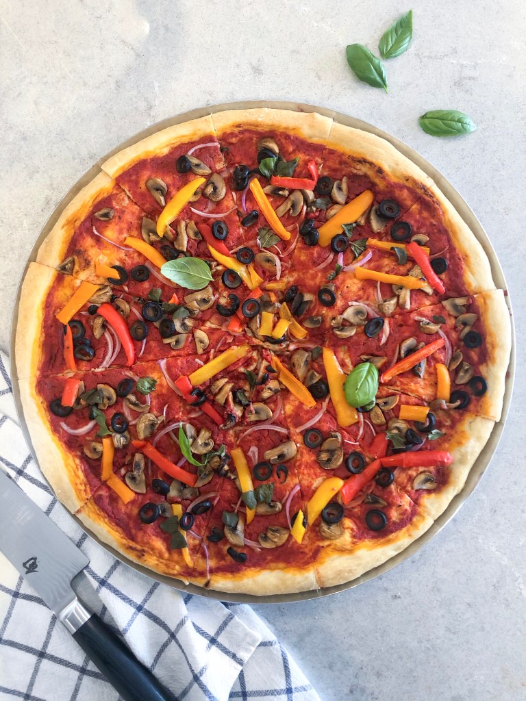 Our go-to pizza toppings include a variety of veggies such as bell peppers, red onion, sautĂ©ed mushrooms, sliced black olives, spinach, and canned artichokes. You could also definitely sprinkle on your favourite vegan cheese if you’d like. Adding some fresh basil on top after it comes out of the oven is also a must whenever we have it on hand!